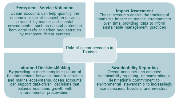 Ocean accounts are integrated records of economic, social and environmental data related to marine and coastal areas. Ocean accounts offer a framework to quantify the economic value of marine ecosystems that often underpin coastal tourism. The implementation of ocean accounts in coastal tourism destinations can offer several key benefits, summarised in Figure 1.